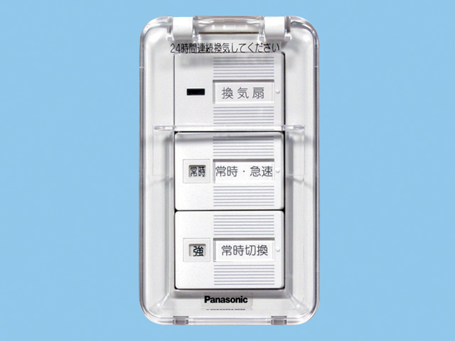 [機能/他] 換気扇スイッチ単相100V 0.5A(~10W用) ON-OFF、常時-急速、常時切替(強-弱)樹脂プレート、カバー付特長ワイド21タイプの24時間換気用スイッチ●常時換気を啓蒙する透明カバー付き●ON-OFFと常時運転-急速運転と常時切替(強-弱)●定格0.5A●24時間ラベル入り
