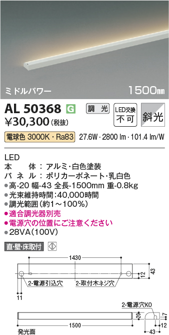 [機能/他] LED(電球色)LED本体:アルミ・白色塗装パネル:ポリカーボネート・乳白色●高-20 幅-43 全長-1500mm 重-0.8kg●消費電力:27.6W●定格光束:2800 lm●固有エネルギー消費効率:101.4 lm/W●演色性:Ra83●色温度:3000K●光束維持時間:40,000時間●調光範囲(約1~100%)●適合調光器別売●電源穴の位置にご注意ください●28VA(100V)
