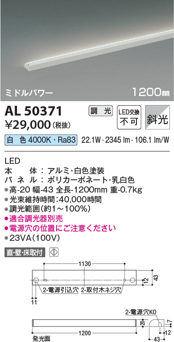 [機能/他] LED(白色)LED本体:アルミ・白色塗装パネル:ポリカーボネート・乳白色●高-20 幅-43 全長-1200mm 重-0.7kg●消費電力:22.1W●定格光束:2345 lm●固有エネルギー消費効率:106.1 lm/W●演色性:Ra83●色温度:4000K●光束維持時間:40,000時間●調光範囲(約1~100%)●適合調光器別売●電源穴の位置にご注意ください●23VA(100V)