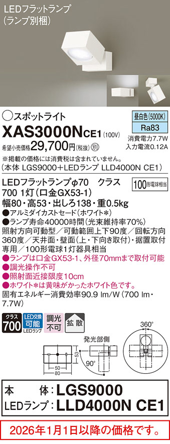 [機能/他] ランプ別梱包光源◆LEDフラットランプφ70 クラス700 1灯(口金GX53-1)◆色温度:5000 K◆光源寿命40000時間(光束維持率70%)寸法・質量◆幅:80 mm◆高:53 mm◆出しろ:138 mm◆質量:0.5 kg仕様・注意事項◆器具光束:700 lm◆電圧:100 V◆消費電力:7.7 W◆消費効率:90.9 lm/W◆【アルミダイカストセード】ホワイト◆Ra83◆照射方向可動型◆可動範囲上下90度◆回転方向360度◆天井面・壁面(上・下向き取付)・据置取付専用◆100形電球1灯器具相当◆入力電流(100V時):0.12 A◆調光操作不可◆照射面近接限度10cm