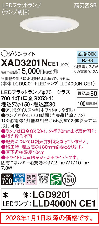 [機能/他] ランプ別梱包光源◆LEDフラットランプφ70 クラス700 1灯(口金GX53-1)◆色温度:5000 K◆光源寿命40000時間(光束維持率70%)寸法・質量◆埋込穴径:φ150 mm◆埋込高:80 mm仕様・注意事項◆器具光束:710 lm◆電圧:100 V◆消費電力:7.3 W◆消費効率:97.2 lm/W◆【アルミダイカスト枠】ホワイトつや消し◆Ra83◆100形電球1灯器具相当◆55度までの傾斜天井に取付可能◆入力電流(100V時):0.13 A◆調光操作不可◆配光については斜天井対応となっていません。◆施工時、埋込高さは80mm必要となります。◆直下近接限度10cm