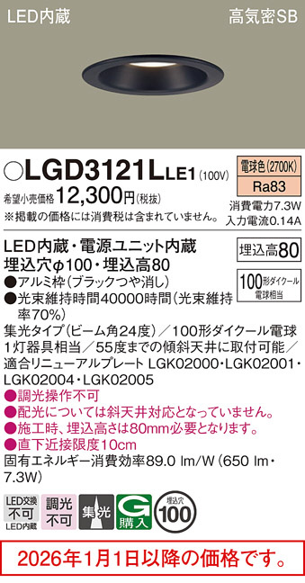 [機能/他] LED内蔵、電源ユニット内蔵光源◆LED(電球色タイプ)◆色温度:2700 K◆光源寿命40000時間(光束維持率70%)寸法・質量◆埋込穴径:φ100 mm◆埋込高:80 mm仕様・注意事項◆器具光束:650 lm◆電圧:100 V◆消費電力:7.3 W◆消費効率:89 lm/W◆【アルミ枠】ブラックつや消し◆Ra83【適合リニューアルプレート】LGK02000【適合リニューアルプレート】LGK02001【適合リニューアルプレート】LGK02004【適合リニューアルプレート】LGK02005◆集光タイプ(ビーム角24度)◆100形ダイクール電球1灯器具相当◆55度までの傾斜天井に取付可能◆入力電流(100V時):0.14 A◆調光操作不可◆配光については斜天井対応となっていません。◆施工時、埋込高さは80mm必要となります。◆直下近接限度10cm