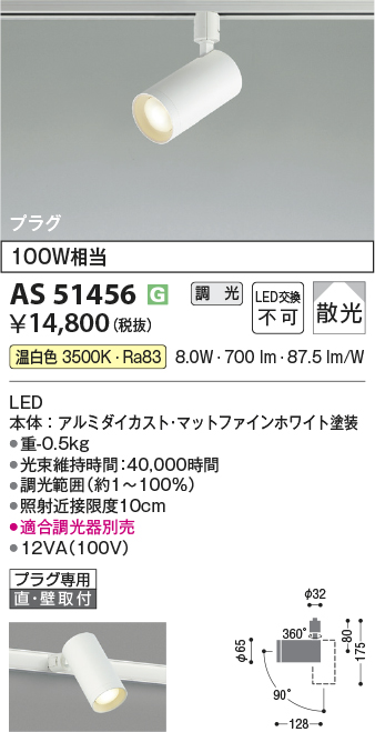 [機能/他] LED(温白色)100W相当LED本体:アルミダイカスト・マットファインホワイト塗装●高-175 本体幅-φ65 本体長-128mm 重-0.5kg●消費電力:8.0W●定格光束:700 lm●固有エネルギー消費効率:87.5 lm/W●演色性:Ra83●色温度:3500K●光束維持時間:40,000時間●調光範囲(約1~100%)●照射近接限度10cm●適合調光器別売●12VA(100V)
