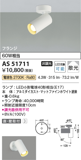 [機能/他] LED(電球色)60W相当ランプ:LED小形電球40形相当(E17)本体:アルミダイカスト・マットファインホワイト塗装●高-166 本体幅-φ65 本体長-128mm 重-0.6kg●消費電力:4.3W●定格光束:315 lm●固有エネルギー消費効率:73.2 lm/W●演色性:Ra80●色温度:2700K●ランプ寿命:40,000時間●照射近接限度10cm●調光器併用不可●8VA(100V)