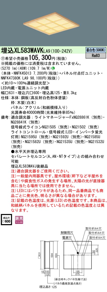 天井埋込型 LED(昼白色) 一体型LEDベースライト 和紙柄パネル(木製格子)タイプ 連続調光型調光タイプ(ライコン別売) スクエアタイプ/パネル付型 コンパクト形蛍光灯FHP45形3灯器具相当 FHP45形(NNFK45013+NNFK47380KLA9)