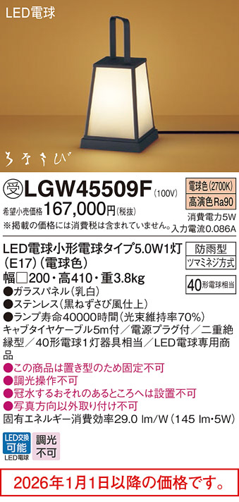 [機能/他] ランプ同梱包光源◆LED電球小形電球タイプ5.0W1灯(E17)(電球色)◆色温度:2700 K◆光源寿命40000時間(光束維持率70%)寸法・質量◆幅:□200 mm◆高:410 mm◆質量:3.8 kg仕様・注意事項◆器具光束:145 lm◆電圧:100 V◆消費電力:5 W◆消費効率:29 lm/W◆デザイン分類:数寄屋◆【ガラスパネル】乳白◆【ステンレス】黒ねずさび風仕上◆据置型◆高演色Ra90◆キャブタイヤケーブル5m付◆電源プラグ付◆二重絶縁型◆40形電球1灯器具相当◆LED電球専用商品◆入力電流(100V時):0.086 A◆この商品は置き型のため固定不可◆調光操作不可◆冠水するおそれのあるところへは設置不可◆写真方向以外取り付け不可