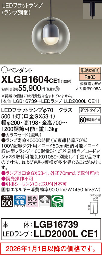 [機能/他] ランプ別梱包光源◆LEDフラットランプφ70 クラス500 1灯(口金GX53-1)◆色温度:2700 K◆光源寿命40000時間(光束維持率70%)寸法・質量◆幅:φ200 mm◆高:198 mm◆全高:700~1200 mm 調節可能◆質量:1.3 kg仕様・注意事項◆器具光束:450 lm◆電圧:100 V◆消費電力:5 W◆消費効率:90 lm/W◆【ガラスセード】透明◆吊下型、ガラスセードタイプ・拡散タイプ・ダクトタイプ◆Ra83◆100V配線ダクト用◆コード50cm収納可能◆コード収納型フランジ◆60形電球1灯器具相当◆コードアジャスタ取付可能(LK01089・別売)◆手造り品ですので寸法、および色味・模様が多少異なることがあります。◆入力電流(100V時):0.08 A◆調光操作不可◆引掛シーリングには取り付け不可