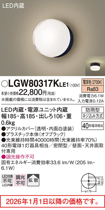 [機能/他] LED内蔵、電源ユニット内蔵光源◆LED(電球色タイプ)◆色温度:2700 K◆光源寿命40000時間(光束維持率70%)寸法・質量◆幅:185 mm◆高:185 mm◆出しろ:106 mm◆質量:0.6 kg仕様・注意事項◆器具光束:205 lm◆電圧:100 V◆消費電力:6.1 W◆消費効率:33.6 lm/W◆デザイン分類:Stylish Moder◆【アクリルカバー】透明・内面白塗装◆【プラスチック本体】オフブラック◆天井直付型・壁直付型、拡散タイプ・密閉型◆Ra83◆40形電球1灯器具相当◆密閉型◆壁面・天井面取付専用◆入力電流(100V時):0.12 A◆調光操作不可