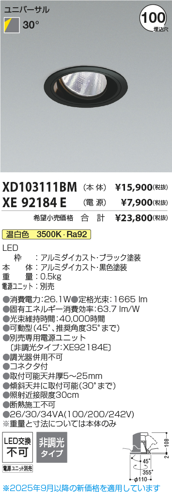[機能/他] LED(温白色)HID35W相当LED枠:アルミダイカスト・ブラック塗装本体:アルミダイカスト・ブラック塗装重量:0.5kg電源ユニット:別売●色温度:3500K●演色性:Ra92●光束維持時間:40,000時間●可動型(45°、推奨角度35°まで)●専用電源ユニット別売●適合調光器別売●コネクタ付●取付可能天井厚5~25mm●傾斜天井に取付可能(30°まで)●照射近接限度30cm●断熱施工不可