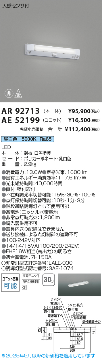 [機能/他] LEDランプLED(昼白色)LEDセード:ポリカーボネート・乳白色●消費電力:13.6W●色温度:5000K●演色性:Ra85●光束維持時間:40,000時間●調光器併用不可●非常点灯時光束:1,200lm●100-242V対応●14/14/15VA(100/200/242V)