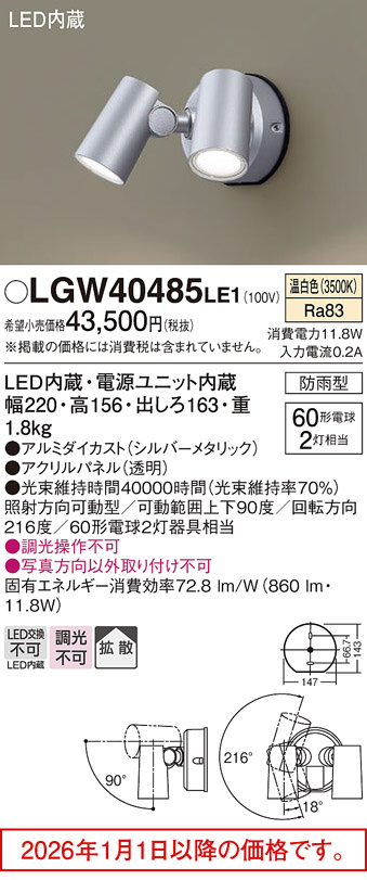 [機能/他] LED内蔵、電源ユニット内蔵光源◆LED(温白色タイプ)◆色温度:3500 K◆光源寿命40000時間(光束維持率70%)寸法・質量◆幅:220 mm◆高:154 mm◆出しろ:163 mm◆質量:1.8 kg仕様・注意事項◆器具光束:860 lm◆電圧:100 V◆消費電力:11.8 W◆消費効率:72.8 lm/W◆【アルミダイカスト】シルバーメタリック◆【アクリルパネル】透明◆壁直付型、拡散タイプ◆Ra83◆照射方向可動型◆可動範囲上下90度◆回転方向180度◆60形電球2灯器具相当◆入力電流(100V時):0.24 A◆調光操作不可◆写真方向以外取り付け不可