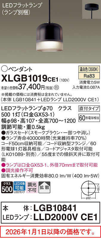 [機能/他] ランプ別梱包光源◆LEDフラットランプφ70 クラス500 1灯(口金GX53-1)◆色温度:3500 K◆光源寿命40000時間(光束維持率70%)寸法・質量◆幅:φ98 mm◆高:107 mm◆全高:700~1200 mm 調節可能◆質量:0.5 kg仕様・注意事項◆器具光束:400 lm◆電圧:100 V◆消費電力:5 W◆消費効率:80 lm/W◆【ガラスセード】スモークブラウン・一部つや消し◆吊下型、ガラスセードタイプ・拡散タイプ・直付タイプ◆Ra83◆コード50cm収納可能◆コード収納型フランジ◆60形電球1灯器具相当◆コードアジャスタ取付可能(LK01089・別売)◆55度までの傾斜天井に取付可能◆入力電流(100V時):0.087 A◆調光操作不可