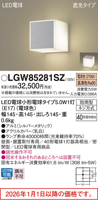 [機能/他] 発光ダイオード(LED)5W幅145・高145・出しろ145アルミ(シルバーメタリック)・アクリルカバー(乳白)