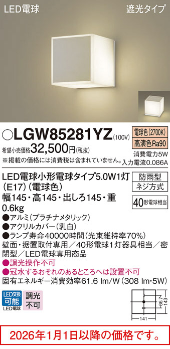 [機能/他] 発光ダイオード(LED)5W幅145・高145・出しろ145アルミ(プラチナメタリック)・アクリルカバー(乳白)