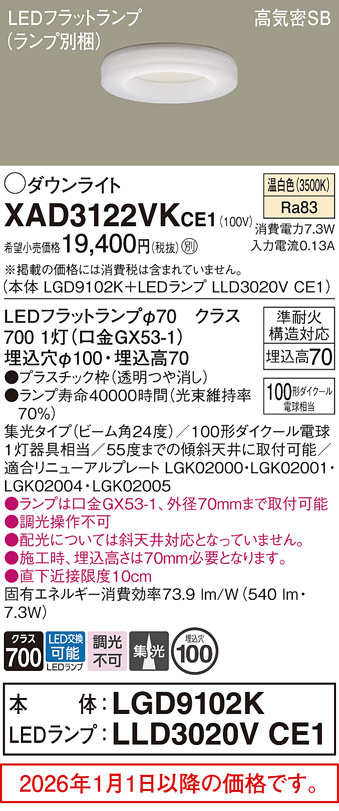[機能/他] ランプ別梱包光源◆LEDフラットランプφ70 クラス700 1灯(口金GX53-1)◆色温度:3500 K◆光源寿命40000時間(光束維持率70%)寸法・質量◆埋込穴径:φ100 mm◆埋込高:70 mm仕様・注意事項◆器具光束:540 lm◆電圧:100 V◆消費電力:7.3 W◆消費効率:73.9 lm/W◆【プラスチック枠】透明つや消し◆天井埋込型、埋込穴φ100、浅型7H・高気密SB形・ビーム角24度・集光タイプ◆Ra83【適合リニューアルプレート】LGK02000【適合リニューアルプレート】LGK02001【適合リニューアルプレート】LGK02004【適合リニューアルプレート】LGK02005◆集光タイプ(ビーム角24度)◆100形ダイクール電球1灯器具相当◆55度までの傾斜天井に取付可能◆入力電流(100V時):0.13 A◆調光操作不可◆配光については斜天井対応となっていません。◆施工時、埋込高さは70mm必要となります。◆直下近接限度10cm