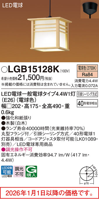 [機能/他] ランプ同梱包光源◆LED電球一般電球タイプ4.4W1灯(E26)(電球色)◆色温度:2700 K◆光源寿命40000時間(光束維持率70%)寸法・質量◆幅:□202 mm◆高:175 mm◆全高:490 mm◆質量:0.6 kg仕様・注意事項◆器具光束:417 lm◆電圧:100 V◆消費電力:4.4 W◆消費効率:94.7 lm/W◆デザイン分類:書院◆【木製】白木◆天井吊下型、40形電球1灯相当(照射面中心40形電球1灯相当)・引掛シーリング方式◆Ra84◆丸型フランジ付◆引掛シーリング方式◆40形電球1灯器具相当◆コードアジャスタ取付可能(LK01089・別売)◆LED電球専用商品◆入力電流(100V時):0.072 A◆調光操作不可
