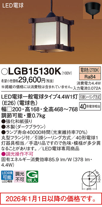 [機能/他] ランプ同梱包光源◆LED電球一般電球タイプ4.4W1灯(E26)(電球色)◆色温度:2700 K◆光源寿命40000時間(光束維持率70%)寸法・質量◆幅:□200 mm◆高:168 mm◆全高:468~768 mm 調節可能◆質量:0.7 kg仕様・注意事項◆器具光束:378 lm◆電圧:100 V◆消費電力:4.4 W◆消費効率:85.9 lm/W◆デザイン分類:民芸◆【木製】ダークブラウン◆天井吊下型、40形電球1灯相当(照射面中心40形電球1灯相当)・引掛シーリング方式◆Ra84◆丸型フランジ付◆引掛シーリング方式◆40形電球1灯器具相当◆手造り品ですので色味・模様が多少異なることがあります。◆LED電球専用商品◆入力電流(100V時):0.072 A◆調光操作不可
