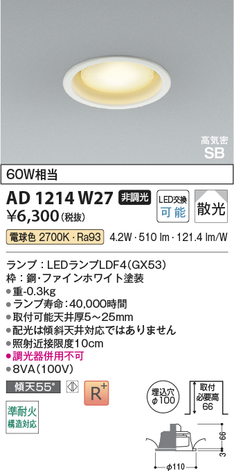 [機能/他] LED(電球色)60W相当ランプ:LEDランプLDF4(GX53)枠:鋼・ファインホワイト塗装●幅-φ110 出幅-3 埋込穴径-φ100 埋込高-66mm 重-0.3kg●消費電力:4.2W●定格光束:510 lm●固有エネルギー消費効率:121.4 lm/W●演色性:Ra93●色温度:2700K●ランプ寿命:40,000時間●取付可能天井厚5~25mm●配光は傾斜天井対応ではありません●照射近接限度10cm●調光器併用不可●8VA(100V)