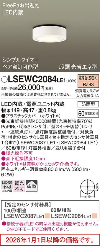 [機能/他] LED内蔵、電源ユニット内蔵光源◆LED(電球色タイプ)◆色温度:2700 K◆光源寿命40000時間(光束維持率70%)寸法・質量◆幅:φ149 mm◆高:47 mm◆質量:0.8 kg仕様・注意事項◆器具光束:500 lm◆器具光束:500 lm◆電圧:100 V◆消費電力:6.2 W◆消費効率:80.6 lm/W◆【プラスチックカバー】ホワイト◆天井直付型、拡散タイプ◆Ra83◆PaPIRs・明るさセンサ付◆壁スイッチ切替(センサ←→連続点灯)◆点灯照度調整機能付◆対象負荷:指定のセンサなし器具4台+指定のセンサ付器具1台まで(LSEWC2087 LE1・LSEWC2084 LE1)◆60形電球1灯器具相当◆送り用端子台付◆入力電流(100V時):0.1 A◆調光操作不可◆直下近接限度10cm