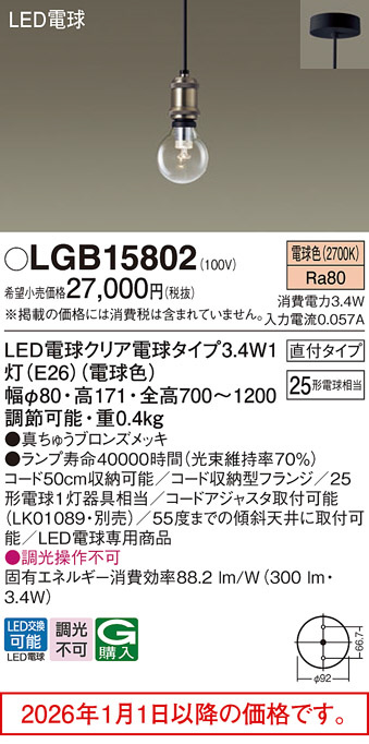 [機能/他] ランプ同梱包光源◆LED電球クリア電球タイプ3.4W1灯(E26)(電球色)◆色温度:2700 K◆光源寿命40000時間(光束維持率70%)寸法・質量◆幅:φ80 mm◆高:171 mm◆全高:700~1200 mm 調節可能◆質量:0.4 kg仕様・注意事項◆全光束:300 lm◆電圧:100 V◆消費電力:3.4 W◆消費効率:88.2 lm/W◆デザイン分類:VINTAGE◆天井吊下型、直付タイプ◆Ra80◆コード50cm収納可能◆コード収納型フランジ◆25形電球1灯器具相当◆コードアジャスタ取付可能(LK01089・別売)◆55度までの傾斜天井に取付可能◆LED電球専用商品◆入力電流(100V時):0.057 A◆調光操作不可