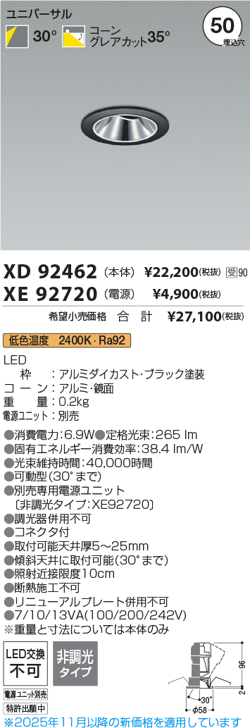 [機能/他] LEDランプLED(低色温度)LED枠:アルミダイカスト・ブラック塗装コーン:樹脂・鏡面重量:0.2kg電源ユニット:別売●消費電力:6.9W●色温度:2400K●演色性:Ra92●定格光束:265 lm●固有エネルギー消費効率:38.4 lm/W●光束維持時間:40,000時間●可動型(30°まで)●別売専用電源ユニット(非調光タイプ:XE92720)●調光器併用不可●取付可能天井厚5~25mm●照射近接限度10cm●傾斜天井に取り付け可能(30°まで)●リニューアルプレート併用不可●コネクタ付●電源によって設置必要高さが異なります。仕様図をご確認ください。●断熱施工不可●7/10/13VA(100/200/242V)※重量と寸法については本体のみ