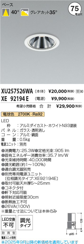 [機能/他] LEDランプLED(電球色)LED枠:アルミダイカスト・ホワイトN93塗装パネル:ガラス・透明消しコーン:アルミ・鏡面重量:0.5kg電源ユニット:別売●消費電力:25.3W●色温度:2700K●演色性:Ra92●定格光束:905 lm●固有エネルギー消費効率:35.7 lm/W●光束維持時間:40,000時間●調光範囲(約1~100%)●適合調光器別売●別売専用電源ユニット(位相調光タイプ:XE92194E)●取付可能天井厚5~25mm●照射近接限度30cm●軒下対応可能●コネクタ付●断熱施工不可●26VA(100V)※重量と寸法については本体のみ