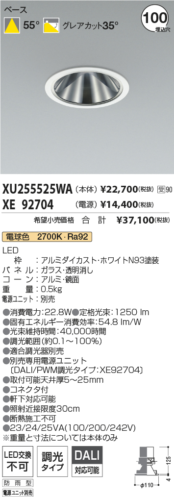 [機能/他] LEDランプLED(電球色)LED枠:アルミダイカスト・ホワイトN93塗装パネル:ガラス・透明消しコーン:アルミ・鏡面重量:0.5kg電源ユニット:別売●消費電力:22.8W●色温度:2700K●演色性:Ra92●定格光束:1250 lm●固有エネルギー消費効率:54.8 lm/W●光束維持時間:40,000時間●調光範囲(約0.1~100%)●適合調光器別売●別売専用電源ユニット(DALI/PWM調光タイプ:XE92704)●取付可能天井厚5~25mm●照射近接限度30cm●軒下対応可能●コネクタ付●断熱施工不可●23/24/25VA(100/200/242V)※重量と寸法については本体のみ