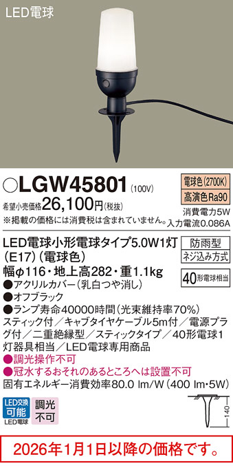 [機能/他] ランプ同梱包光源◆LED電球小形電球タイプ5.0W1灯(E17)(電球色)◆色温度:2700 K◆光源寿命40000時間(光束維持率70%)寸法・質量◆質量:1.1 kg仕様・注意事項◆器具光束:400 lm◆電圧:100 V◆消費電力:5 W◆消費効率:80 lm/W◆【アクリルカバー】乳白つや消し◆地中埋込型、地上高282mm、スティック付◆高演色Ra90◆スティック付◆キャブタイヤケーブル5m付◆電源プラグ付◆二重絶縁型◆スティックタイプ◆40形電球1灯器具相当◆LED電球専用商品◆入力電流(100V時):0.086 A◆調光操作不可◆冠水するおそれのあるところへは設置不可
