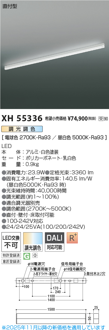 [機能/他] LEDランプLED(電球色+昼白色)LED本体:アルミ・白色塗装セード:ポリカーボネート・乳白色重量:0.9kg●消費電力:23.9W●色温度:2700K~5000K●演色性:Ra93●定格光束:3360 lm●固有エネルギー消費効率:140.5 lm/W●光束維持時間:40,000時間●調光範囲(約1~100%)●直付・壁付・床取付可能●調色範囲(2700K~5000K)●適合調光器別売●100-242V対応●24/24/25VA(100/200/242V)