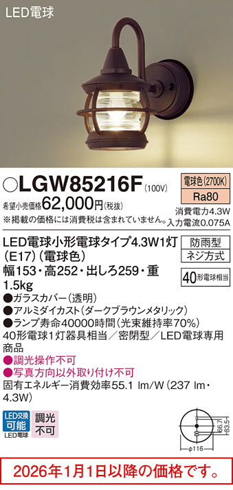 [機能/他] ランプ同梱包光源◆LED電球小形電球タイプ4.3W1灯(E17)(電球色) ◆色温度:2700 K ◆光源寿命40000時間(光束維持率70%)寸法・質量◆幅:153 mm ◆高:252 mm ◆出しろ:259 mm◆質量:1.5 kg仕様・注意事項◆器具光束:237 lm ◆電圧:100 V ◆消費電力:4.3 W ◆消費効率:55.1 lm/W◆デザイン分類:Vitage◆【ガラスカバー】透明◆【アルミダイカスト】ダークブラウンメタリック◆壁直付型、密閉型◆Ra80◆40形電球1灯器具相当◆密閉型◆LED電球専用商品◆入力電流(100V時):0.075 A◆調光操作不可◆写真方向以外取り付け不可