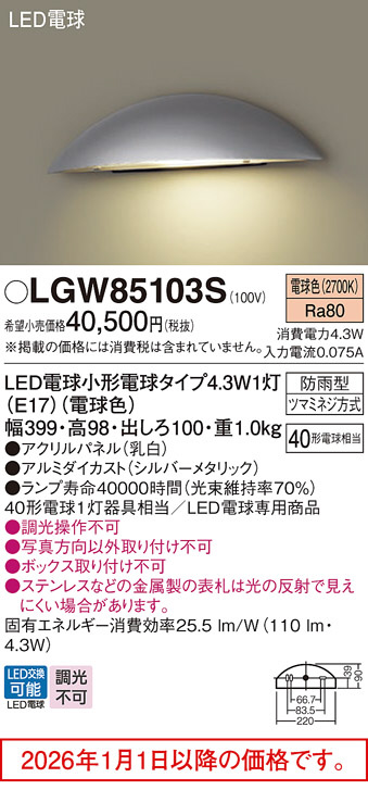 [機能/他] ランプ同梱包光源◆LED電球小形電球タイプ4.3W1灯(E17)(電球色) ◆色温度:2700 K ◆光源寿命40000時間(光束維持率70%)寸法・質量◆幅:399 mm ◆高:98 mm ◆出しろ:100 mm◆質量:1 kg仕様・注意事項◆器具光束:110 lm ◆電圧:100 V ◆消費電力:4.3 W ◆消費効率:25.5 lm/W◆【アクリルパネル】乳白◆【アルミダイカスト】シルバーメタリック◆壁直付型◆Ra80◆40形電球1灯器具相当◆LED電球専用商品◆入力電流(100V時):0.075 A◆調光操作不可◆写真方向以外取り付け不可◆ボックス取り付け不可◆ステンレスなどの金属製の表札は光の反射で見えにくい場合があります。