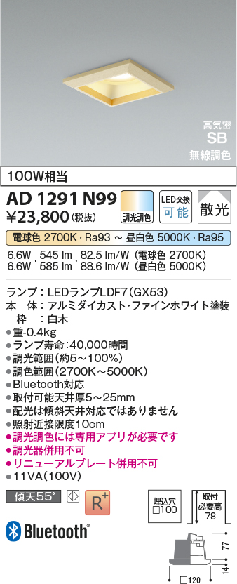 ●幅-□120 出幅-14 埋込穴径-□100 埋込高-77mm 重-0.4kg