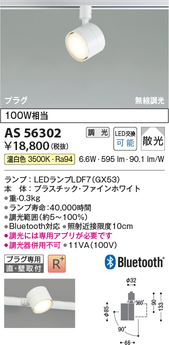 [機能/他] LED(温白色)100W相当ランプ:LEDランプLDF7(GX53)本体:プラスチック・ファインホワイト●高-133 本体長-66 本体幅-φ85mm 重-0.3kg●消費電力:6.6W●定格光束:595 lm●固有エネルギー消費効率:90.1 lm/W●演色性:Ra94●色温度:3500K●ランプ寿命:40,000時間●調光範囲(約5~100%)●Bluetooth対応 ●照射近接限度10cm●調光には専用アプリが必要です●調光器併用不可 ●11VA(100V)