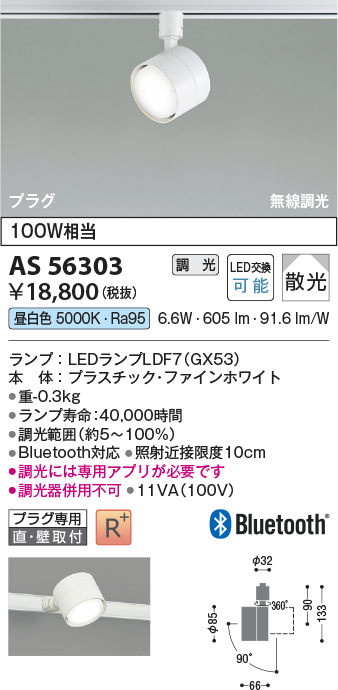 [機能/他] LED(昼白色)100W相当ランプ:LEDランプLDF7(GX53)本体:プラスチック・ファインホワイト●高-133 本体長-66 本体幅-φ85mm 重-0.3kg●消費電力:6.6W●定格光束:605 lm●固有エネルギー消費効率:91.6 lm/W●演色性:Ra95●色温度:5000K●ランプ寿命:40,000時間●調光範囲(約5~100%)●Bluetooth対応 ●照射近接限度10cm●調光には専用アプリが必要です●調光器併用不可 ●11VA(100V)