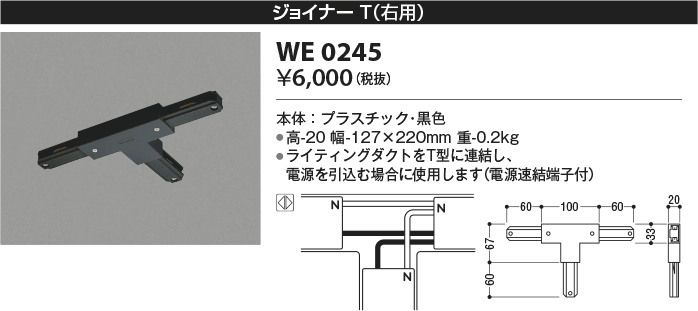 [機能/他] 本体:プラスチック・黒色重量:0.2kg●ライティングダクトをT型に連結し、電源を引込む場合に使用します(電源速結端子付)