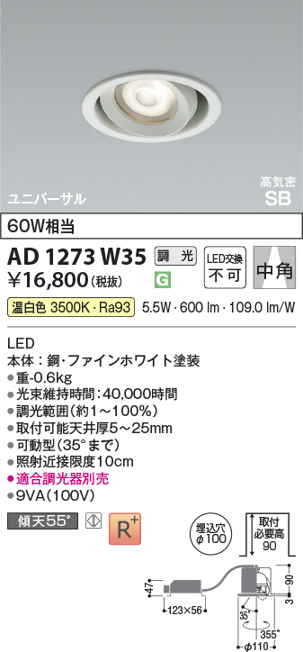 [機能/他] LED(温白色)60W相当LED本体:鋼・ファインホワイト塗装●幅-φ110 出幅-3 埋込穴径-φ100 埋込高-90mm 重-0.6kg●消費電力:5.5W●定格光束:600 lm●固有エネルギー消費効率:109.0 lm/W●演色性:Ra93●色温度:3500K●光束維持時間:40,000時間●調光範囲(約1~100%)●取付可能天井厚5~25mm●可動型(35°まで)●照射近接限度10cm●適合調光器別売●9VA(100V)