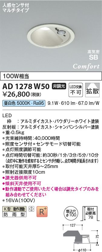 ●幅-φ110 出幅-2 埋込穴径-φ100 埋込高-75mm 重-0.5kg