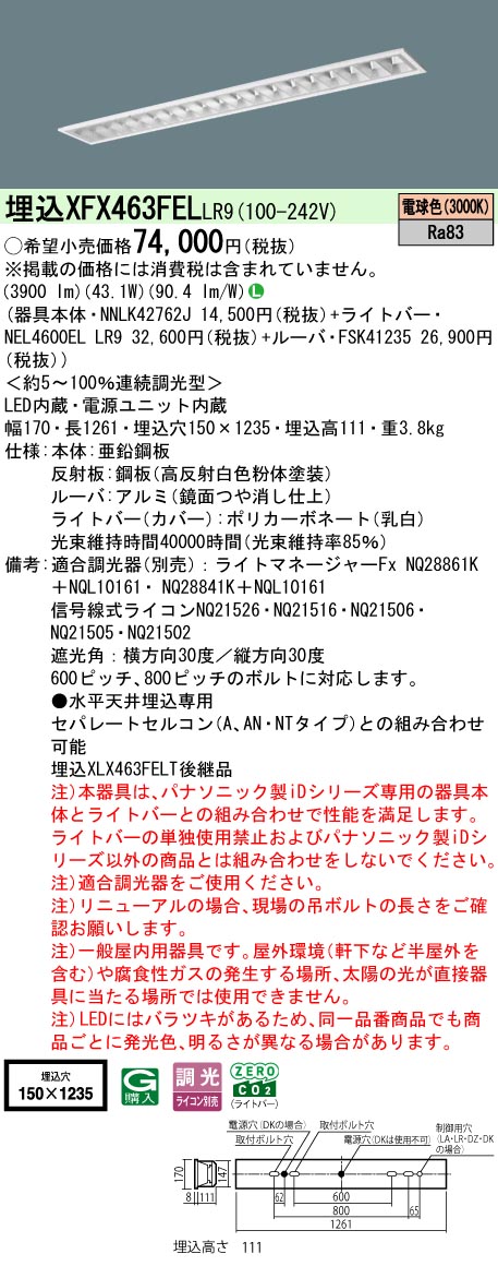 天井埋込型 40形 一体型LEDベースライト 連続調光型調光タイプ(ライコン別売) フリーコンフォート Hf蛍光灯32形高出力型2灯器具相当 Hf32形高出力型2灯・6900 lm(NNLK42762J+NEL4600ELLR9+FSK41235)
