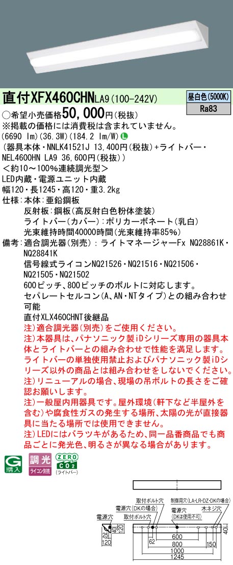 天井直付型 40形 一体型LEDベースライト 連続調光型調光タイプ(ライコン別売) コーナーライト Hf蛍光灯32形高出力型2灯器具相当 Hf32形高出力型2灯・6900 lm(NNLK41521J+NEL4600HNLA9)