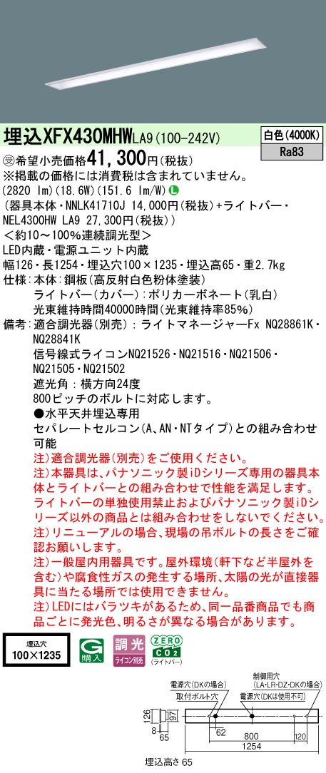 天井埋込型 40形 一体型LEDベースライト 連続調光型調光タイプ(ライコン別売) コンフォート15/下面開放型 Hf蛍光灯32形高出力型1灯器具相当 Hf32形高出力型・3200 lm(NNLK41710J+NEL4300HWLA9)