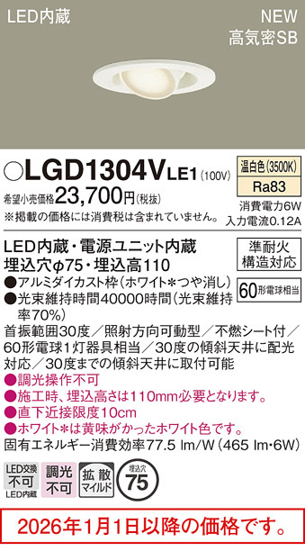[機能/他] LED内蔵、電源ユニット内蔵光源◆LED(温白色タイプ)◆色温度:3500 K◆光束維持時間40000時間(光束維持率70%)寸法・質量◆埋込穴径:φ75 mm◆埋込高:110 mm仕様・注意事項◆器具光束:465 lm◆電圧:100 V◆消費電力:6 W◆消費効率:77.5 lm/W◆【アルミダイカスト枠】ホワイト*つや消し◆天井埋込型、埋込穴φ75、高気密SB形・拡散タイプ(マイルド配光)◆Ra83◆首振範囲30度◆照射方向可動型◆不燃シート付◆60形電球1灯器具相当◆30度の傾斜天井に配光対応◆30度までの傾斜天井に取付可能◆入力電流(100V時):0.12 A◆調光操作不可◆施工時、埋込高さは110mm必要となります。◆直下近接限度10cm◆ホワイト*は黄味がかったホワイト色です。