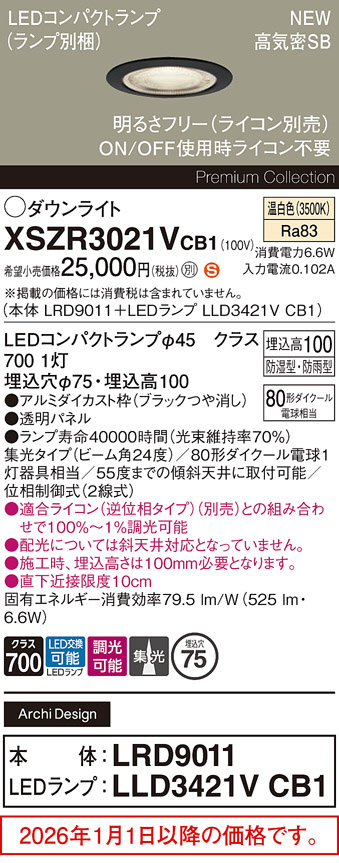 ◆天井埋込型、埋込穴φ75、浅型10H・高気密SB形・ビーム角24度・集光タイプ