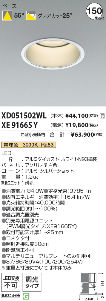 [機能/他] LEDランプLED(電球色)LED枠:アルミダイカスト・ホワイトN93塗装パネル:アクリル・乳白色コーン:アルミ・シルバーショット重量:1.4kg電源ユニット:別売●消費電力:84.0W●色温度:3000K●演色性:Ra83●定格光束:9785 lm●固有エネルギー消費効率:116.4 lm/W●光束維持時間:40,000時間●調光範囲(約1~100%)●適合調光器別売●別売専用電源ユニット(PWM調光タイプ:XE91665Y)●取付可能天井厚1~25mm●照射近接限度30cm●マルチリニューアルプレートのみ併用可●コネクタ付●断熱施工不可●87/86/89VA(100/200/254V)※重量と寸法については本体のみ