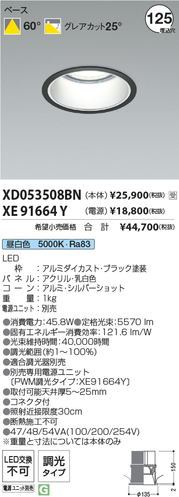 [機能/他] LEDランプLED(昼白色)LED枠:アルミダイカスト・ブラック塗装パネル:アクリル・乳白色コーン:アルミ・シルバーショット重量:1.0kg電源ユニット:別売●消費電力:45.8W●色温度:5000K●演色性:Ra83●定格光束:5570 lm●固有エネルギー消費効率:121.6 lm/W●光束維持時間:40,000時間●調光範囲(約1~100%)●適合調光器別売●別売専用電源ユニット(PWM調光タイプ:XE91664Y)●取付可能天井厚5~25mm●照射近接限度30cm●コネクタ付●断熱施工不可●47/48/54VA(100/200/254V)※重量と寸法については本体のみ