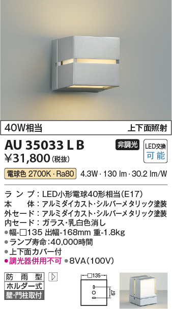 [機能/他] LED(電球色)40W相当ランプ:LED小形電球40形相当(E17)本体:アルミダイカスト・シルバーメタリック塗装外セード:アルミダイカスト・シルバーメタリック塗装内セード:ガラス・乳白色消し●幅-□135 出幅-168mm 重-1.8kg●消費電力:4.3W●定格光束:130 lm●固有エネルギー消費効率:30.2 lm/W●演色性:Ra80●色温度:2700K●ランプ寿命:40,000時間●上下面カバー付●調光器併用不可●8VA(100V)