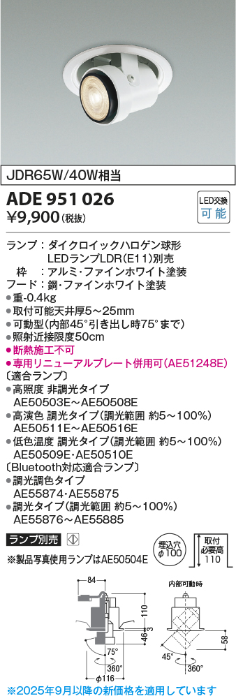 〔Bluetooth対応適合ランプ〕●調光調色タイプ AE55874・AE55875●調光タイプ(調光範囲 約5~100%)AE55876~AE55885