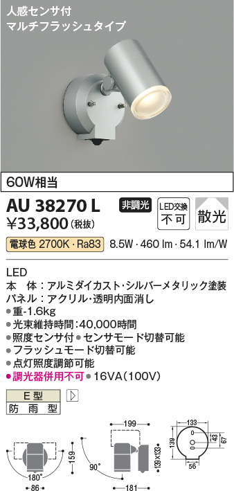 [機能/他] LED(電球色)60W相当LED本体:アルミダイカスト・シルバーメタリック塗装パネル:アクリル・透明内面消し●高-159 幅-86 出幅-181mm 重-1.6kg●消費電力:8.5W●定格光束:460 lm●固有エネルギー消費効率:54.1 lm/W●演色性:Ra83●色温度:2700K●光束維持時間:40,000時間●照度センサ付●センサモード切替可能●フラッシュモード切替可能●点灯照度調節可能●調光器併用不可●16VA(100V)