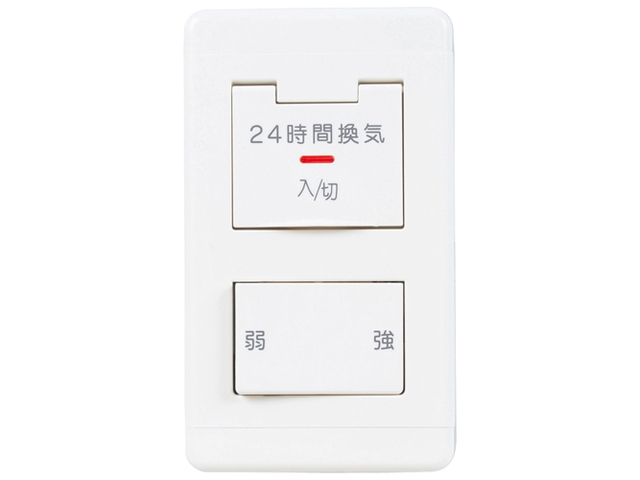 [機能/他] 住宅や事務所での24時間換気を保持する専用コントロールスイッチです。●24時間換気専用●スイッチカバー付で換気運転保持が容易に●強・弱切換タイプ主な機能・仕様・カバー付入・切スイッチ・強・弱スイッチ・運転表示ランプ(LED)・プラスチック製パネル・定格0.5A・AC300V