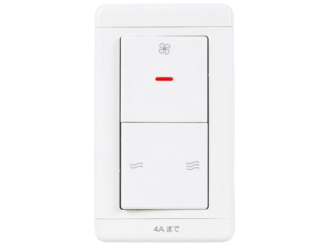[機能/他] 換気扇の運転に使用するコントロールスイッチです。●入・切、強・弱タイプ●壁埋込形スイッチ主な機能・仕様・強・弱スイッチ・運転表示ランプ(LED)・プラスチック製パネル・定格4A・AC300V