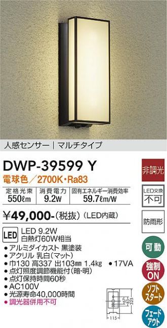 [機能/他] LED 9.2W 電球色/2700Kアルミダイカスト 黒塗装アクリル 乳白(マット)巾130 高337 出103mm1.4kg ●点灯照度調節機能付(暗・明)●点灯保持時間60秒●AC100V●光束維持時間40,000時間●調光器併用不可●17VA定格光束 550 lm消費電力 9.2 W固有エネルギー消費効率 59.7 lm/WRa83白熱灯60W相当